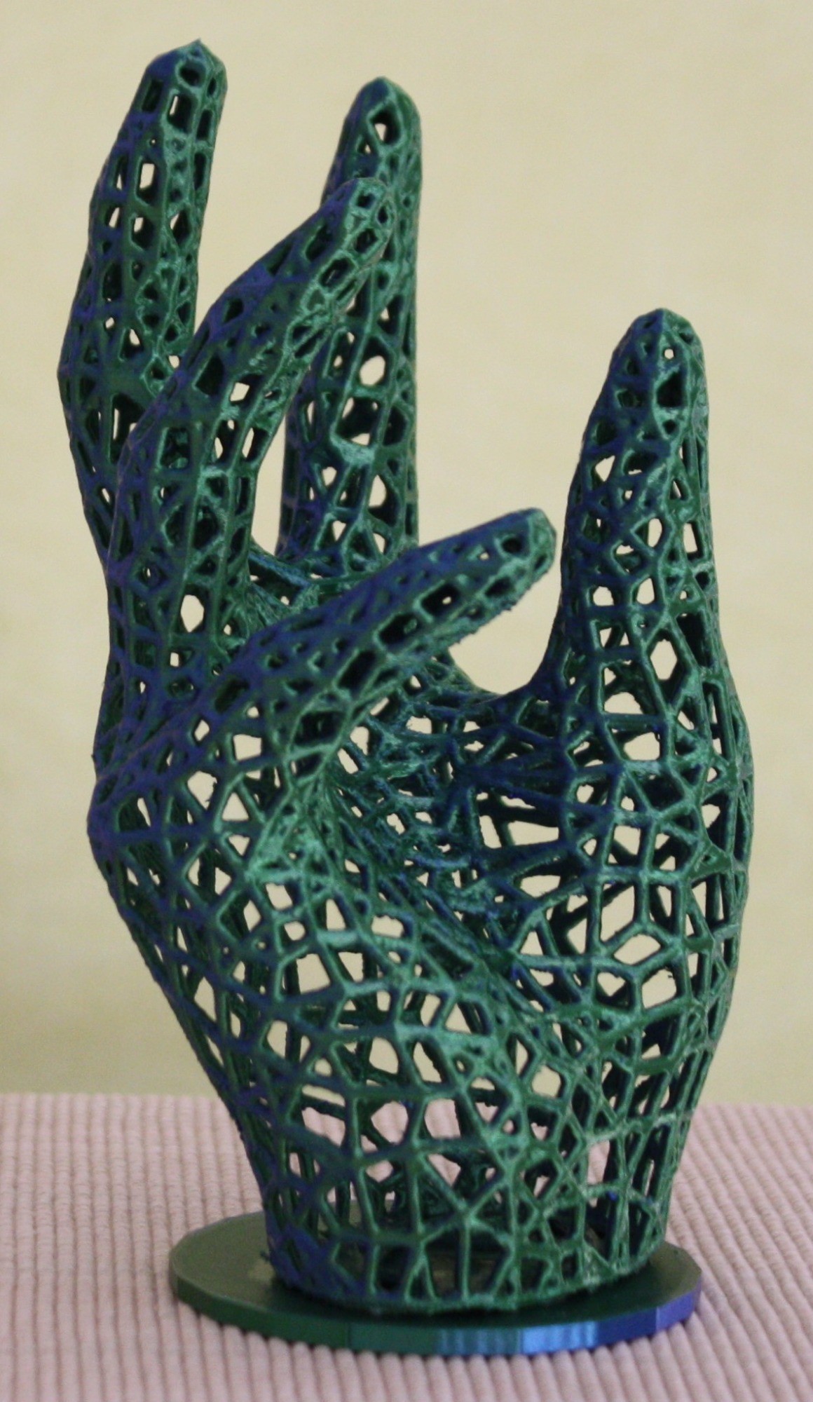 Diese Hand präsentiert sich in einem Netz aus geometrischen Linien die ihre Beweglichkeit betont. Die komplexe und detaillierte Struktur fängt das Licht auf faszinierende Weise ein und schafft verschiedene Schattierungen die aus jedem Blickwinkel anders erscheinen